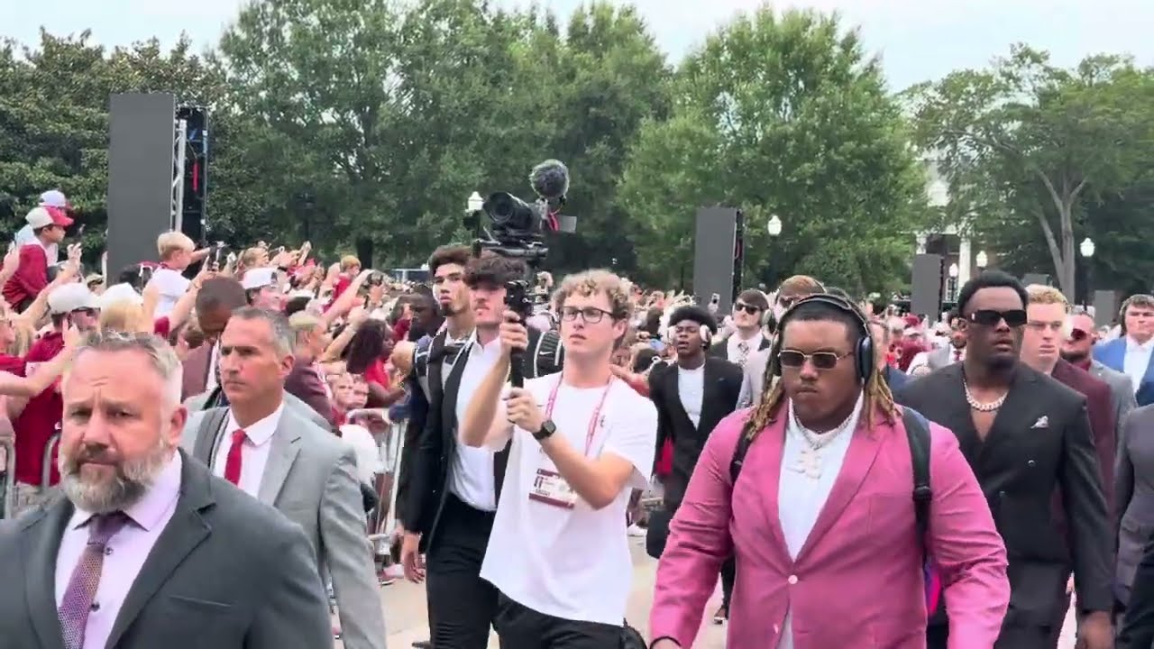 The Alabama Crimson Tide walks into Bryant-Denny Stadium before taking on the ULM Warhawks.