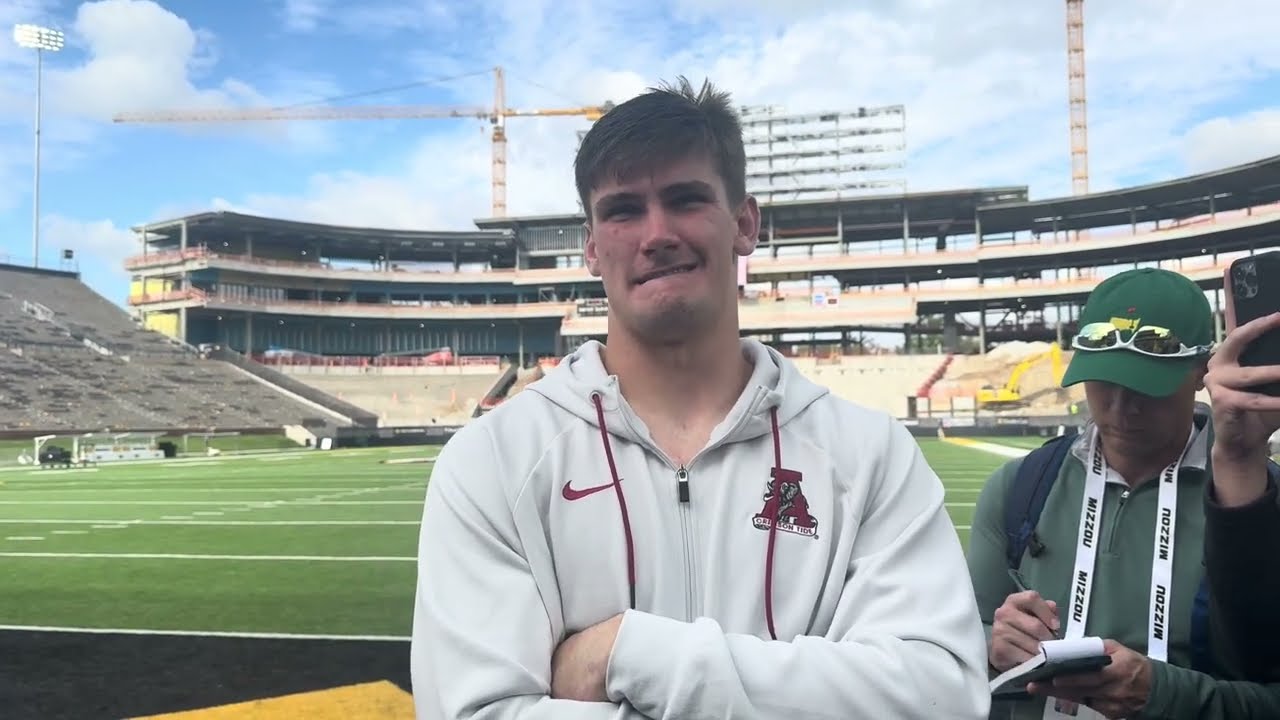 Alabama Football quarterback Ty Simpson speaks to reporters after the Crimson Tide’s 27-24 win over the Missouri Tigers in Columbia, Mo.