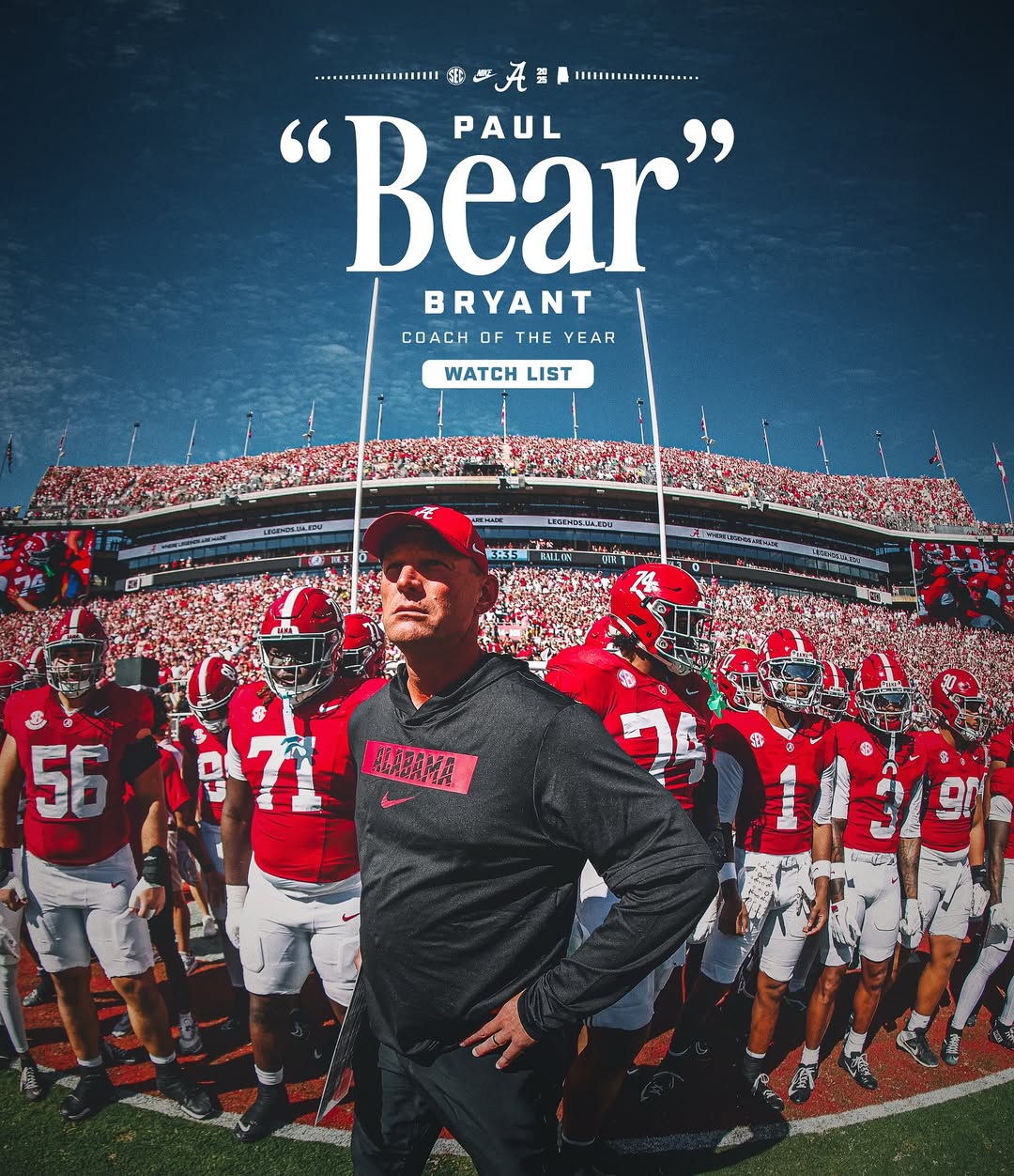 Coach DeBoer has been named to the @bryantawards watchlist for Coach of the Year. ✊