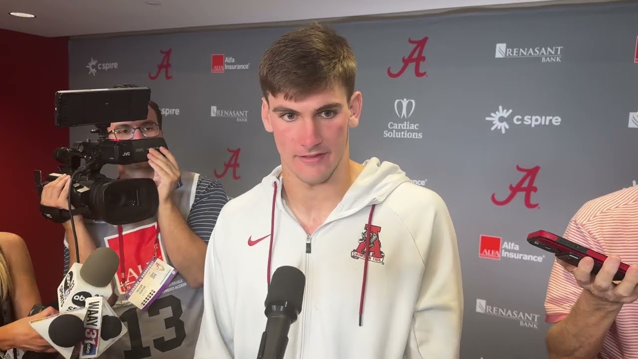 Alabama quarterback Ty Simpson meets with media after the Crimson Tide’s win over Vanderbilt